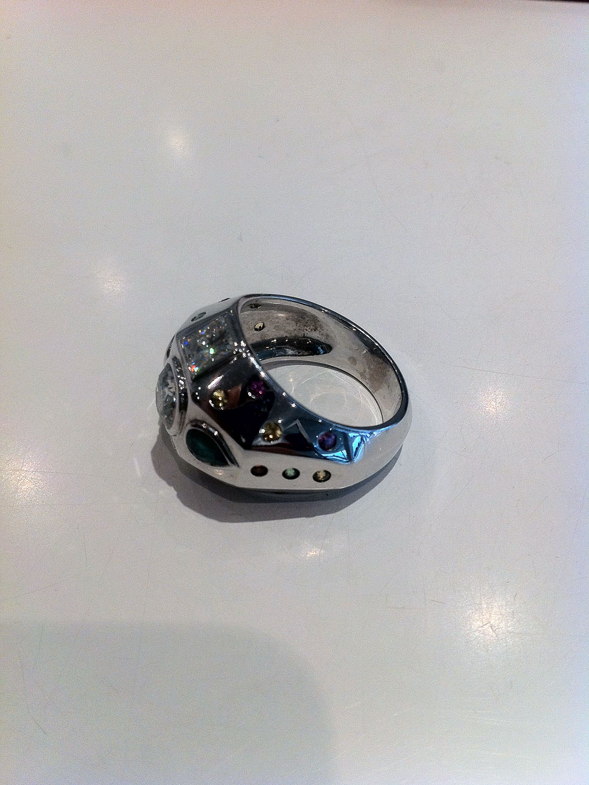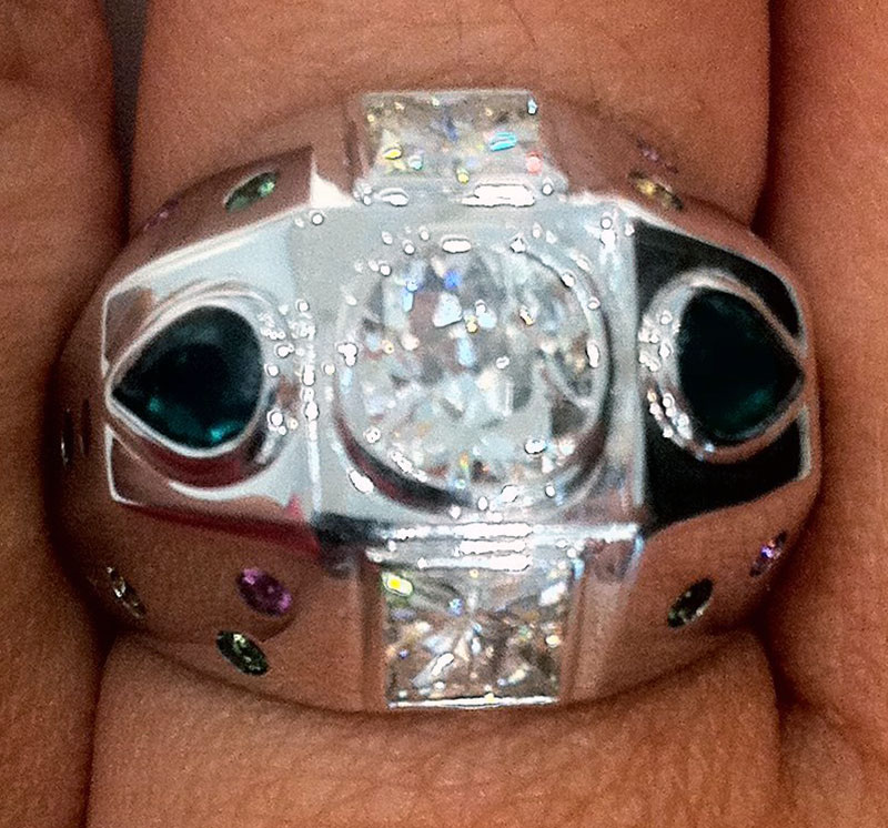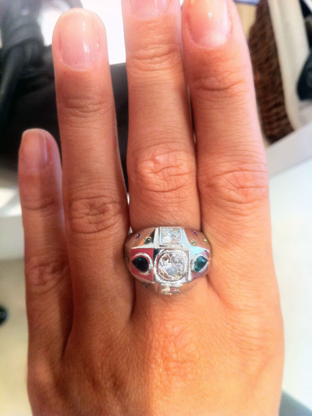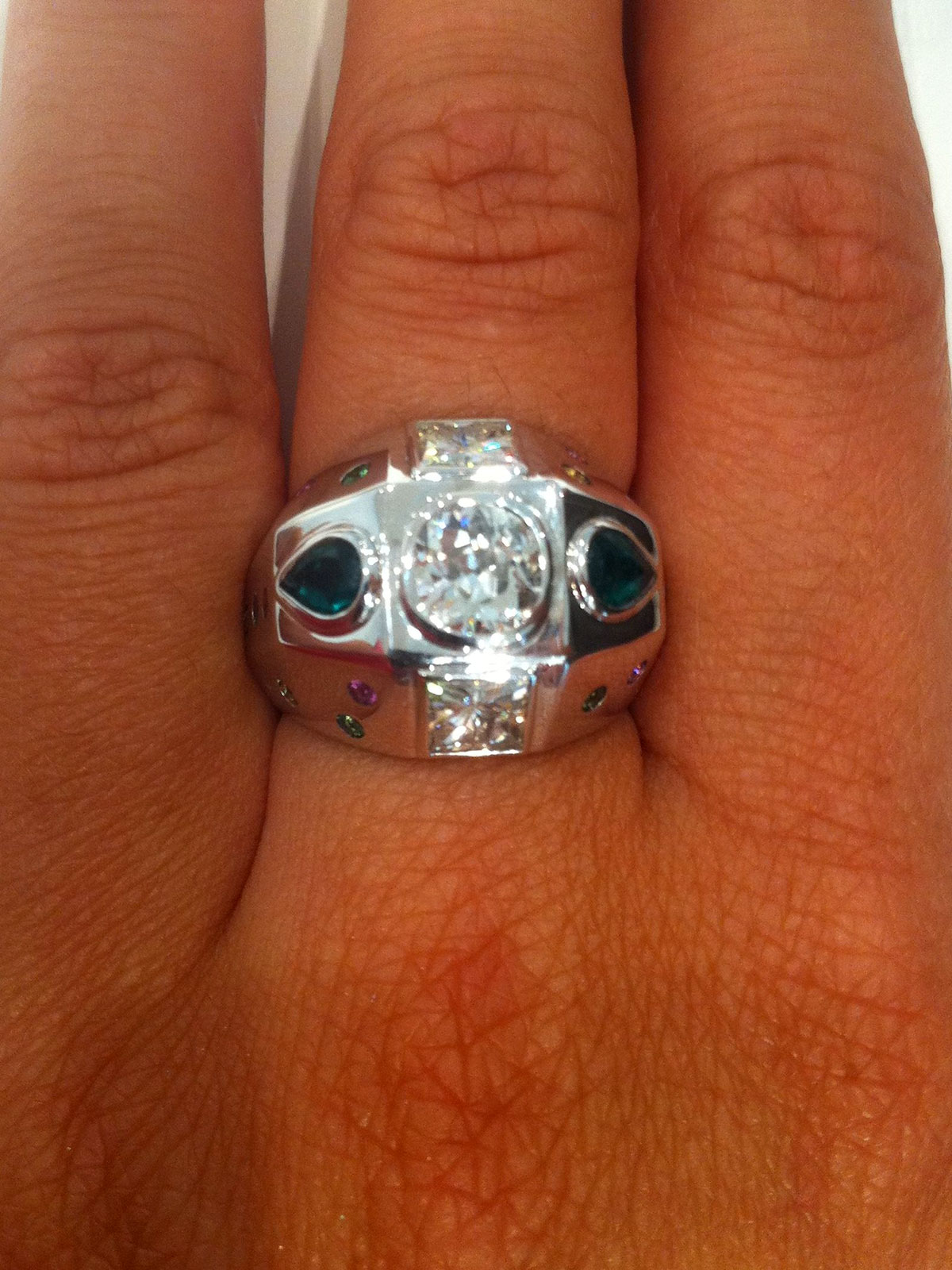 Bague en or blanc serties des pierres de famille d'un cliente diamants et émeraudes.